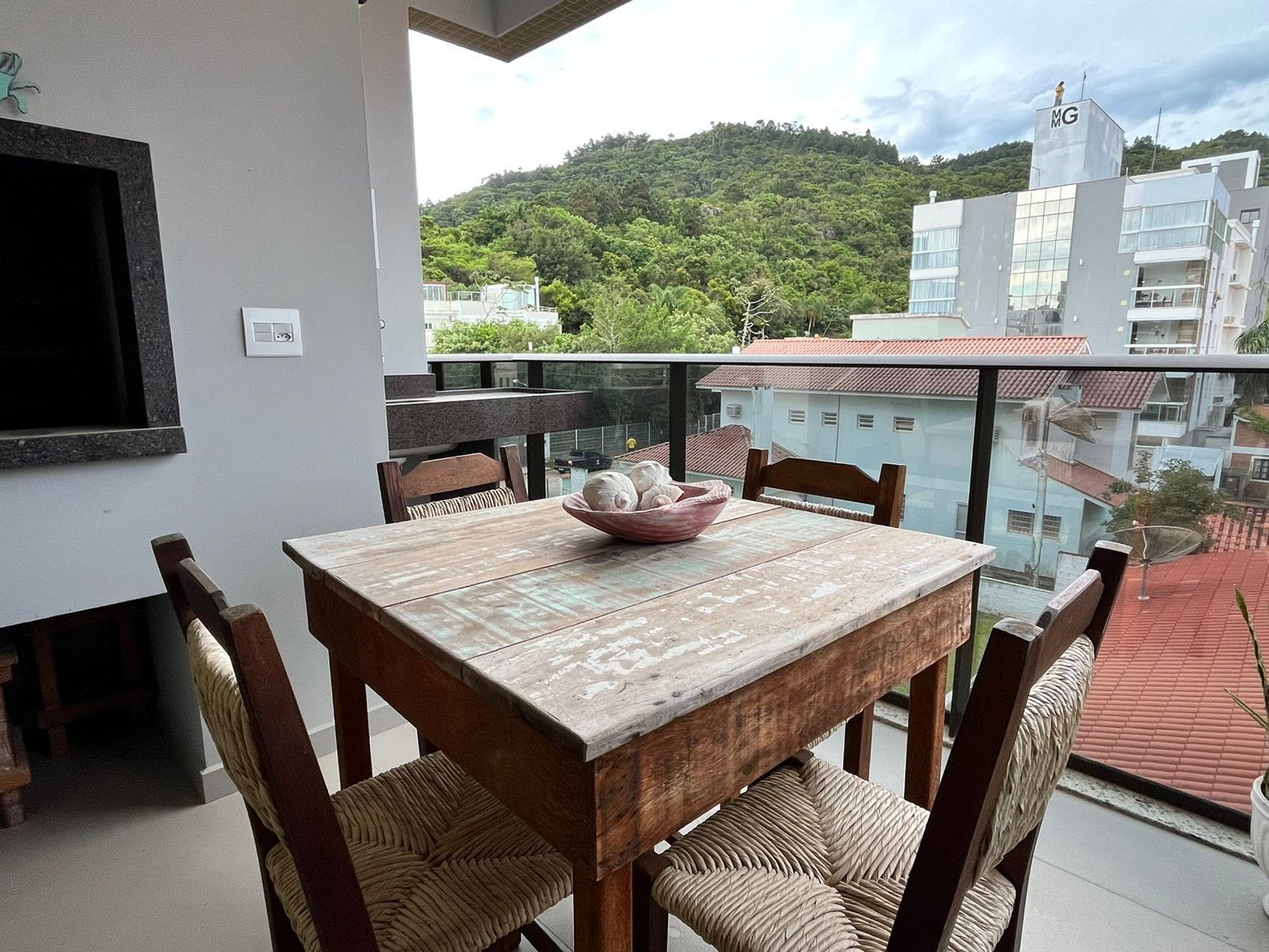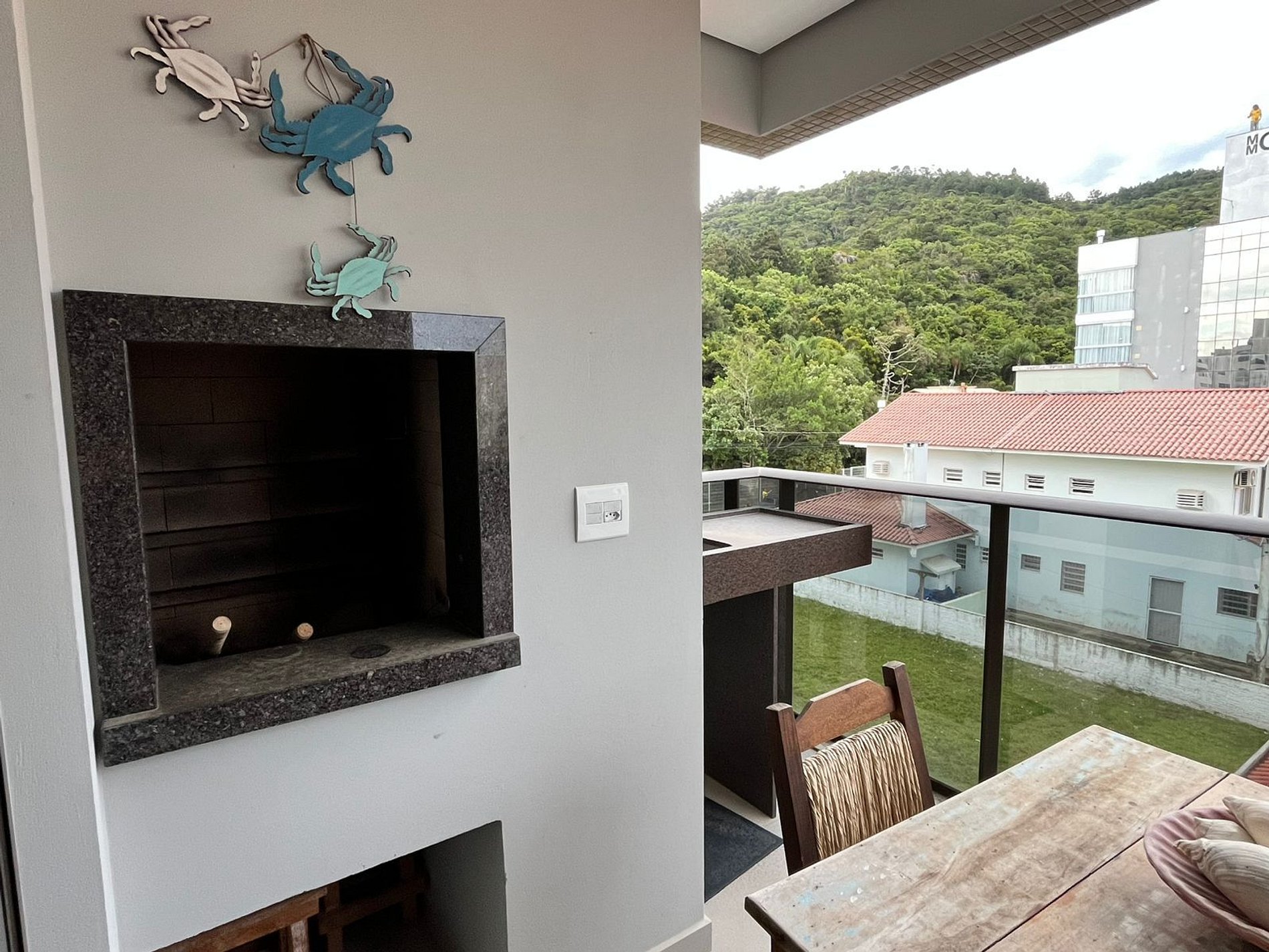 A ampla sacada com churrasqueira e mesa é o espaço ideal para relaxar após um dia de praia,.