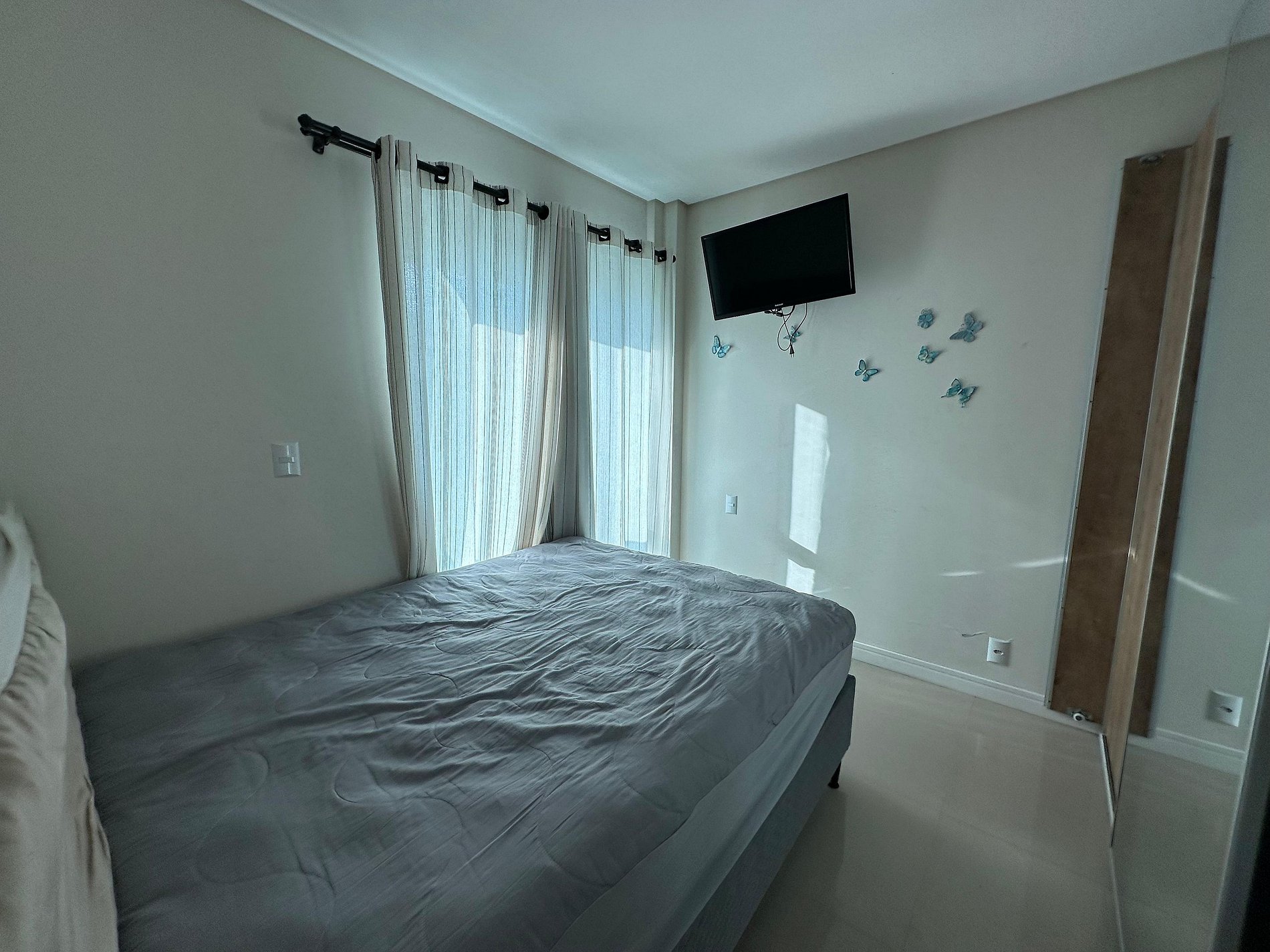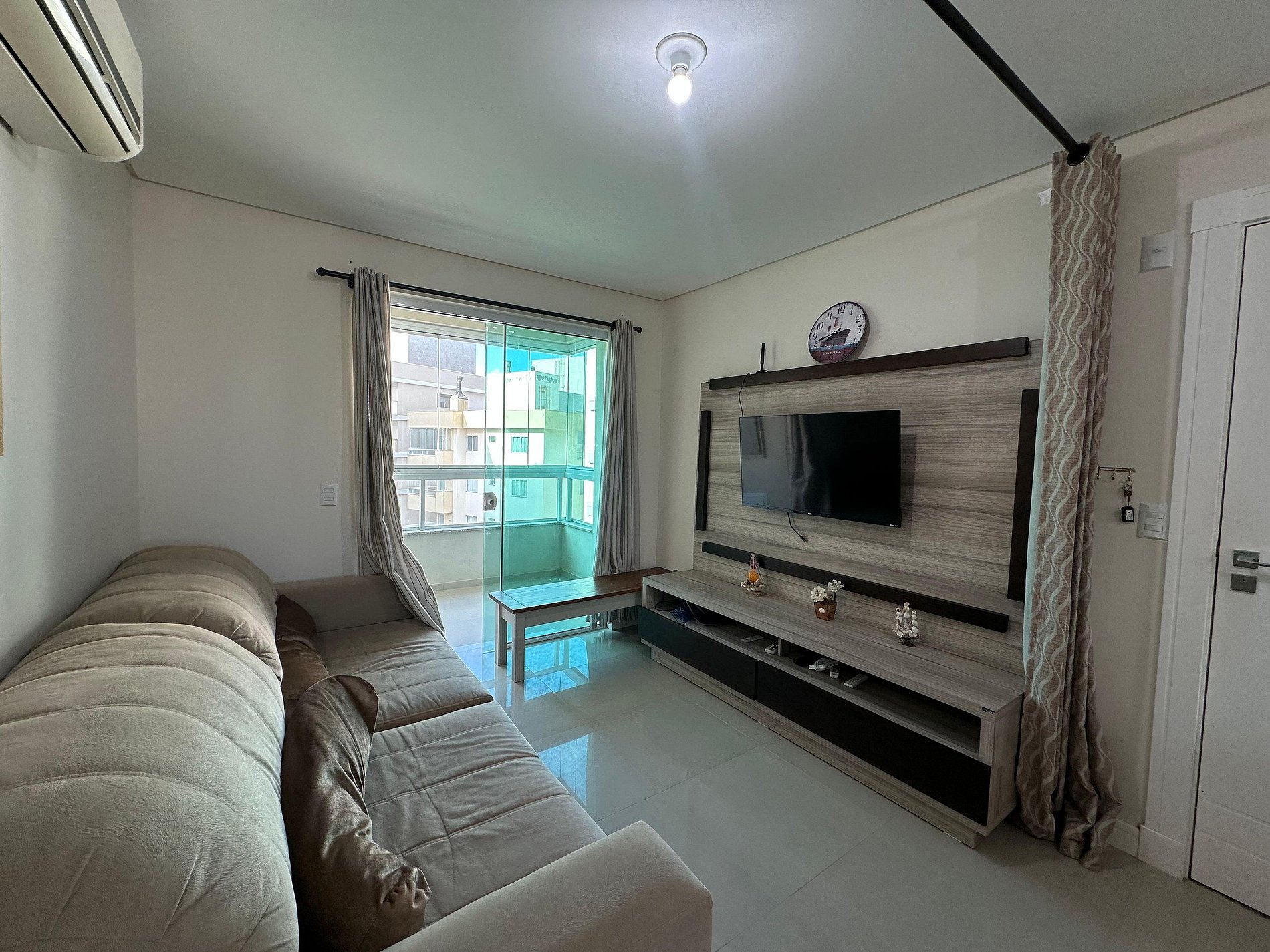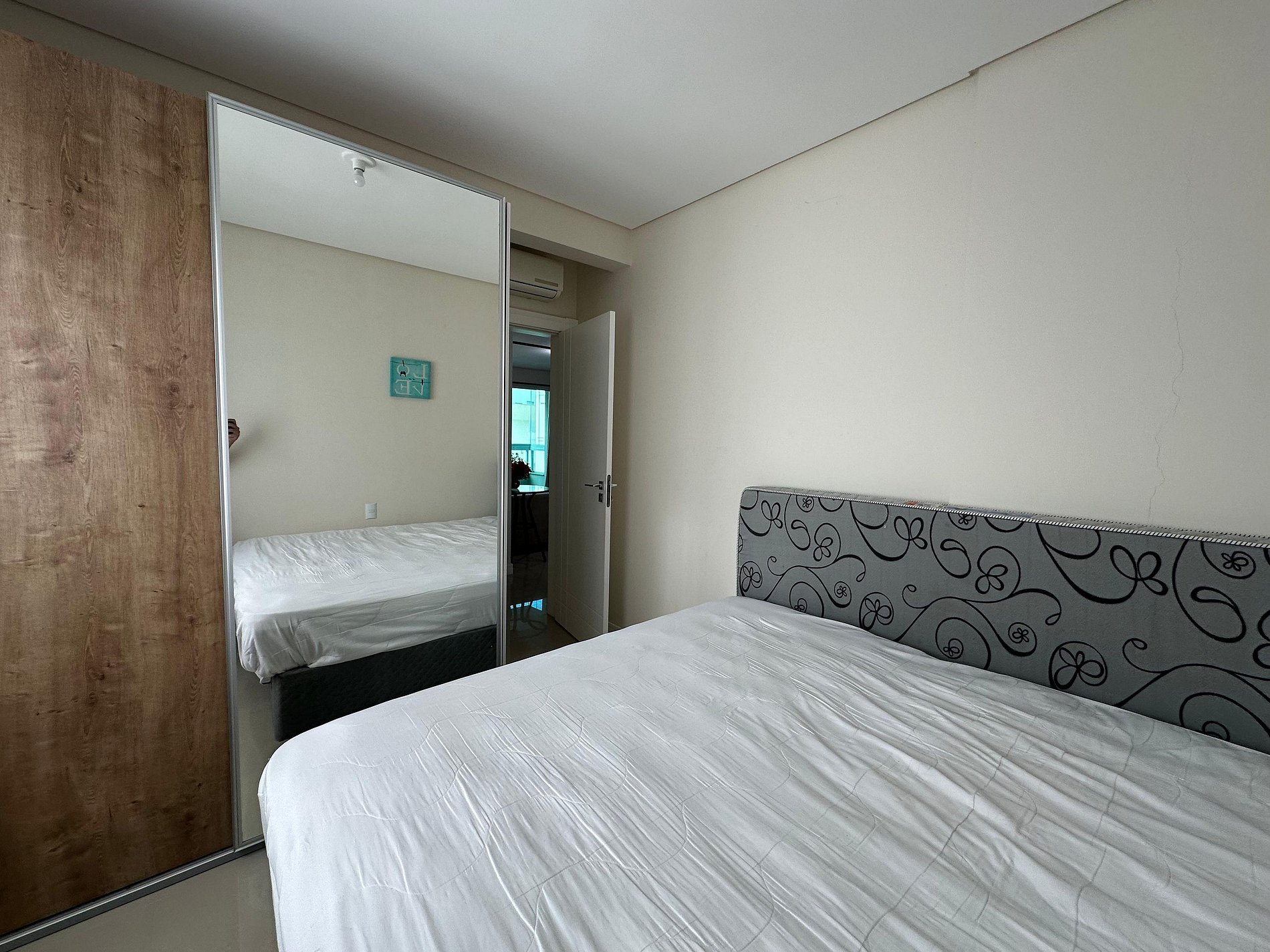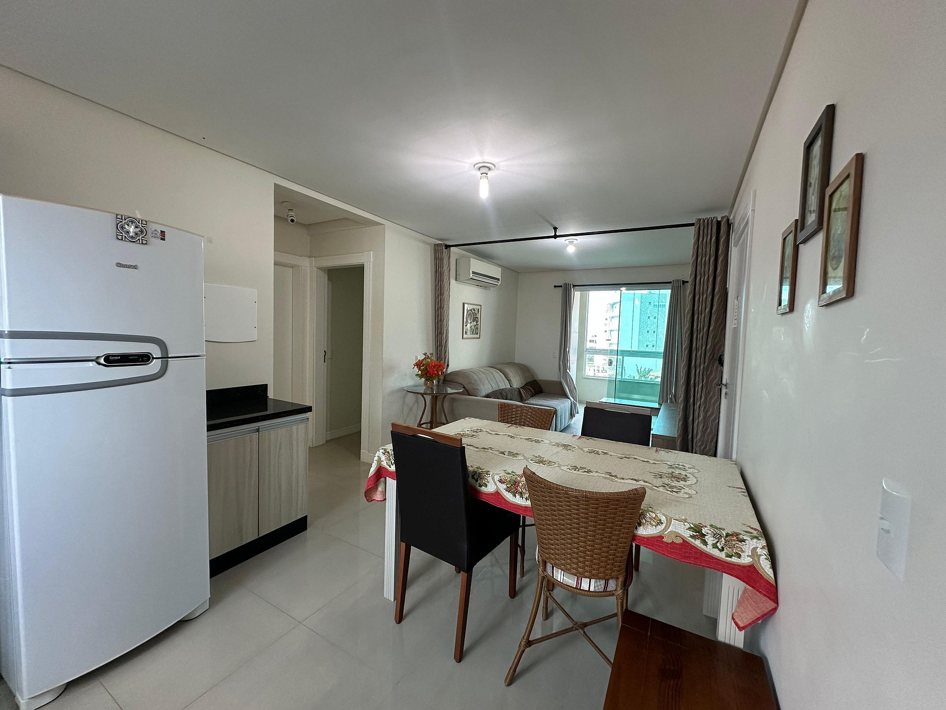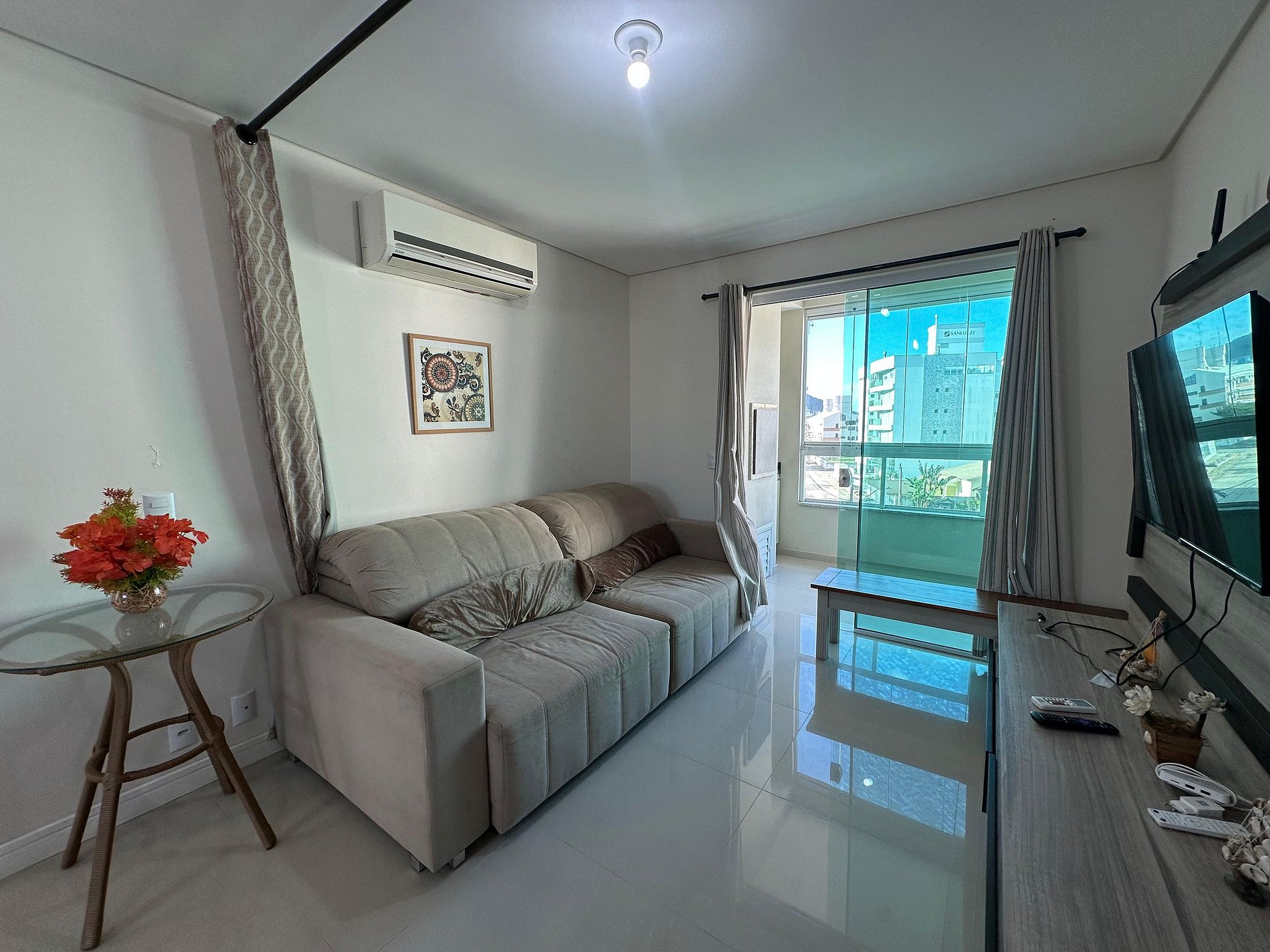 Apartamento mobiliado com 2 dormitórios (1 suíte), sala e cozinha integradas, sacada com churrasqueira e vista lateral para o mar.